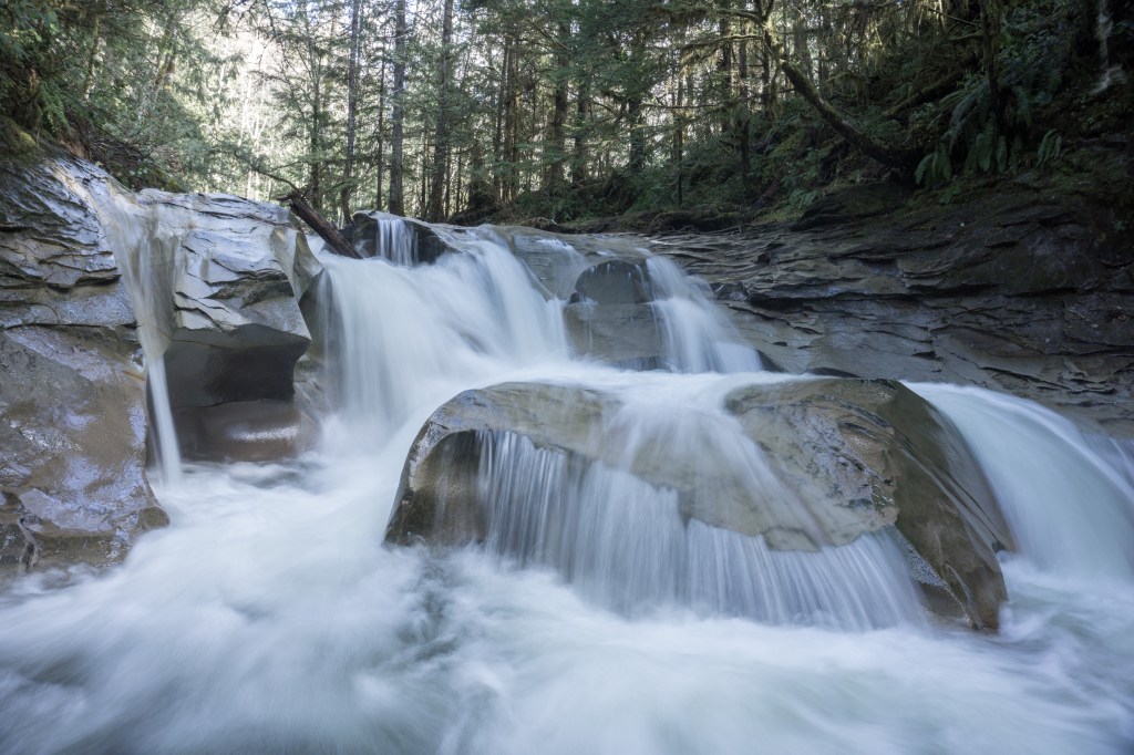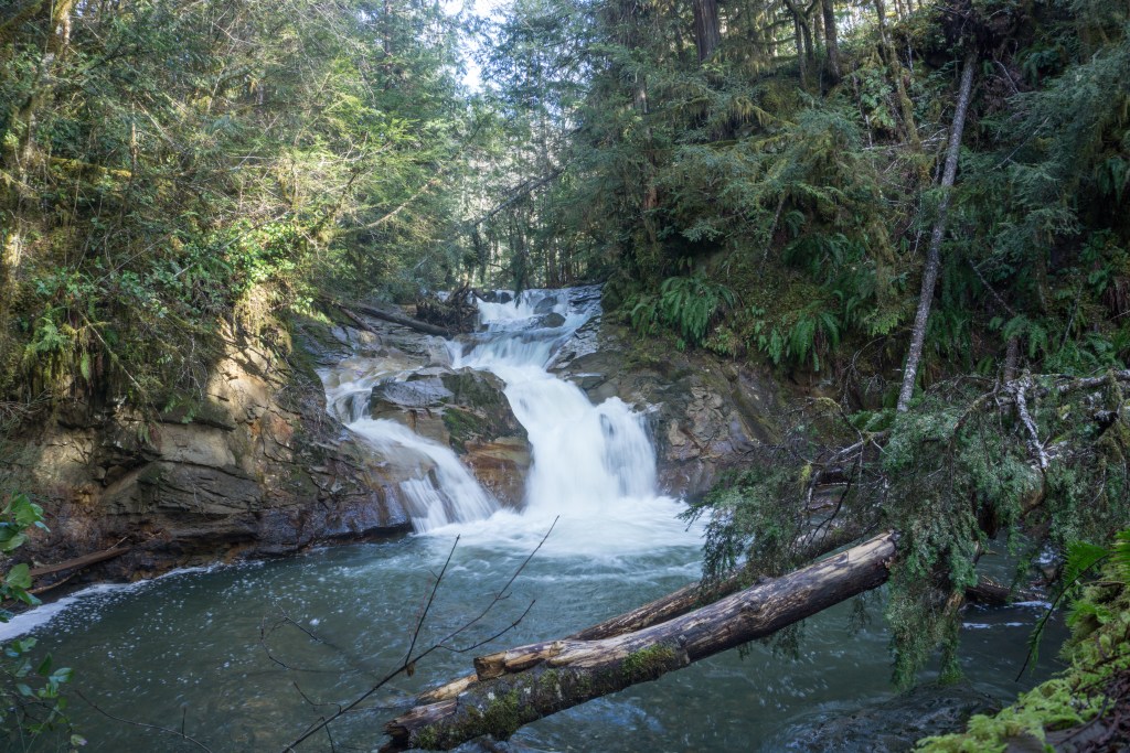 Trail: The trail up to Perseverance Creek, the water way to provide you with the pleasure of of several waterfalls, is fairly easy, it is accessible by almost all capabilities. Out and back the trail is around one hour long, due to it’s temperate nature it is rated as easy. The trail is never very steep, and 90% of the time you are on a packed gravel-dirt road. To start the hike walk into the trail system entrance where Sutton Road turns into Comox Lake. This system is know as the Cumberland Forest and is heavily frequented by mountain bikers at all times of the year, so make sure to keep you head up!